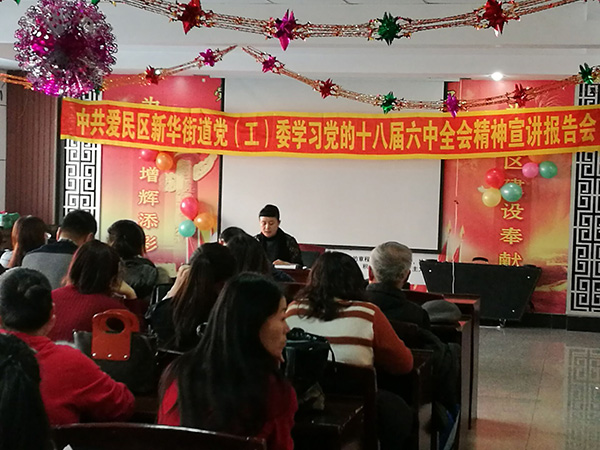 2017年1月6日下午1:30分,集團公司黨委副書記、常務(wù)副總王偉應(yīng)中共愛民區(qū)新華街道黨(工)委的邀請,赴北山社區(qū),為轄區(qū)黨員們解讀《關(guān)于新形式下黨內(nèi)政治生活的若干準(zhǔn)則》和《中國共產(chǎn)黨黨內(nèi)監(jiān)督條例》兩項內(nèi)容。通過王偉書記理論聯(lián)系實際的生動解讀,使與會黨員深刻體會到:黨員的政治生活,只有抓好思想教育這個根本,才能教育黨員筑牢信仰之基,補足精神之鈣,把穩(wěn)思想之舵,只有抓好嚴(yán)明紀(jì)律這個關(guān)鍵,才能把紀(jì)律規(guī)矩立起來、嚴(yán)起來,切實扎緊織密制度的籠子。通過王偉書記對《準(zhǔn)則》和《條例》的解讀,與會黨員進一步增強了“四個意識”特別是核心意識、看齊意識,更加堅定在思想上政治上行動上同以習(xí)近平同志為核心的黨中央保持高度一致,以優(yōu)異的成績迎接黨的十九大的召開,以更加昂揚向上的姿態(tài)為實現(xiàn)“兩個一百年”奮斗目標(biāo)、實現(xiàn)中華民族偉大復(fù)興的中國夢而不懈奮斗!